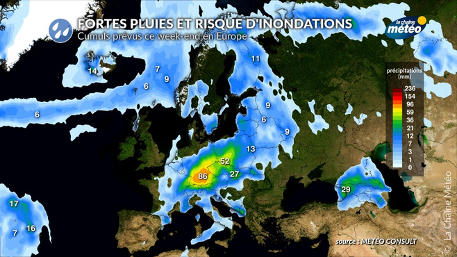 De depressie verplaatst zich zaterdag van Noord-Italië richting Polen. Het is bijzonder actief en wordt geassocieerd met koude lucht op grote hoogte (Koude daling). Dit weekend komen er zware onweersbuien voor tussen Zuid-Duitsland, West-Oostenrijk en Tsjechië. Zaterdag verwachten we in deze gebieden gemiddeld 60 tot 100 mm. Zondag regent het en waait het vaak. In Beieren kan in totaal 100 tot 150 mm worden waargenomen, wat een verhoogd risico op rivieroverstromingen betekent. Vooral de stad München wordt getroffen door dit rode alarm.