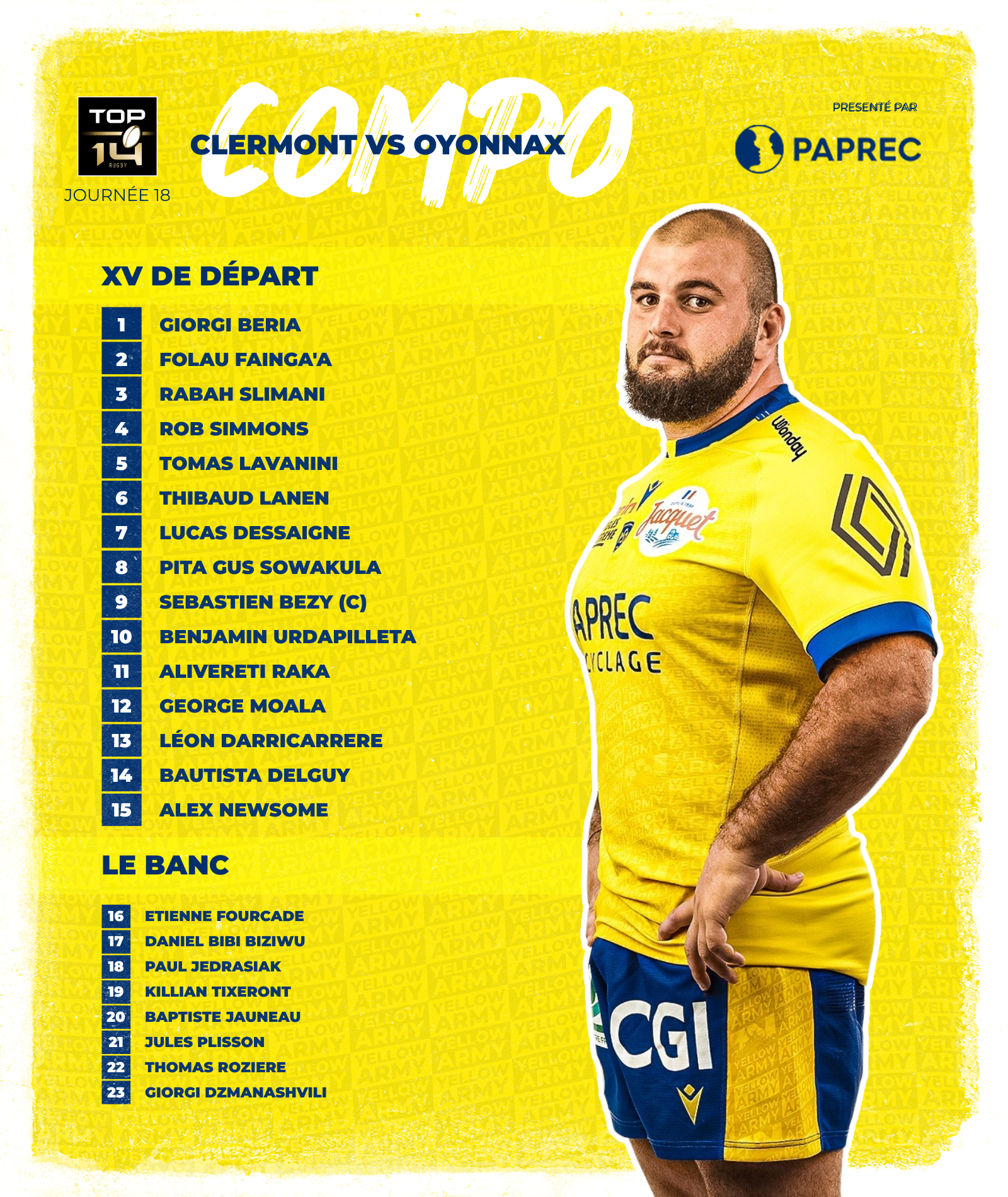 De eerste regel wordt sindsdien het minst beïnvloed door de rotatie Giorgi Beriavindt zijn plaats links van de Auvergne-cluster ernaast Folau Finja en Rabah Soleimani Onderhouden. De tweede linie zal bestaan uit ervaren internationale spelers Rob Simmons en Thomas Lavagnini tijdens Thibaut Lanin Hij gaat een stukje terug en tekent zijn eerste termijn op nummer 3j Winger-lijn sinds november 2022. Zijn optreden als solide baldrager compenseert de blessure van de Argentijn Marcos Kremer, die last heeft van zijn kuit. als Bèta-sap Swakola Hij behoudt zijn plaats in het midden van de derde linie, zo is het Lucas Dessen, wiens temperament en toewijding we kennen, zal zaterdag een nulsomrol spelen. Op de bank komt Etienne Fourcade de plaats in van Robin Collé, terwijl ook Daniel Pepe Bezio, Paul Jedrasjak en Kylian Tixrunt, die al in het Marcel-Deflanders Stadion staan, in de groep zitten en ook Giorgi Dzmanashvili voor de vierde keer wordt opgeroepen dit seizoen. .
